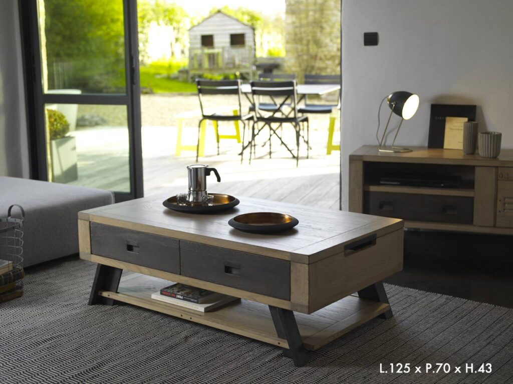 Artcopi L’Artisanat, avec un grand A Dimensions : l 220 x h 50 x p 100 cm Cette collection porte bien son nom, Artisane… Cela respire le savoir faire à la Française et la noblesse des matériaux Sans oublier d’être dans l’air du temps avec des lignes et des finitions actuelles La collection Artisane est en 100% chêne massif avec des finitions chêne vintage et chêne ardoise fumé Ou chêne pierre de lune et chêne ardoise fumé Cette enfilade se compose de 2 portes coulissantes et 2 tiroirs – A l’intérieur, 1 tablette derrière porte gauche haute sur taquets 1 position et 2 tablettes derrière porte droite et gauche réglables sur taquets 3 positions – Les dimensions intérieures des 2 tiroirs sont de L 87 x H 7 x P 33 cm – Le piètement est métallique – Quincaillerie poignées et rivets en métal Artisane compte nombreux meubles de compléments avec des lignes très originales Artisanez-vous ! 100% chêne massif – Finition : Chêne vintage et chêne ardoise fumé enfilade