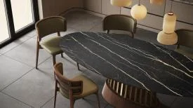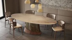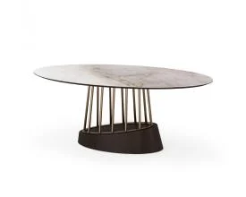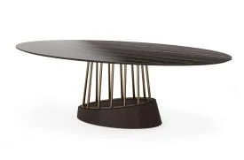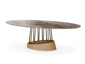 Soleil est une table de repas extravagante au design contemporain. cette table de repas prĂ©sente une combinaison de bois, d’acier inoxydable et de cĂ©ramique.
