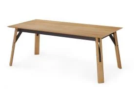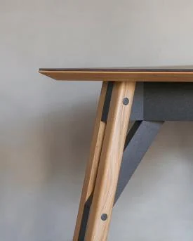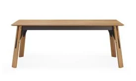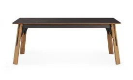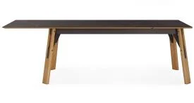 Pieds en chĂŞne massif et plateau en placage de chĂŞne. Plateaux en cĂ©ramique en option. Extensible Ă  toutes les tailles. Disponible avec extension des plateaux au centre ou Ă  l’extrĂ©mitĂ©.