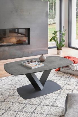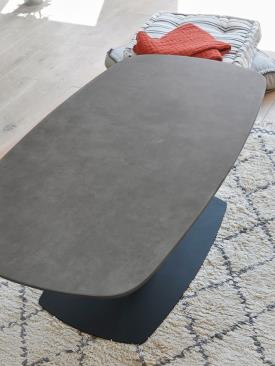 Girardeau Réf. 700903 Dimensions : l 110 x h 43 x p 60 cm Forme ovalisée sur le dessus Dessus céramique gris moucheté épaisseur 11 mm sur verre épaisseur 8mm Piétement métal gris anthracite Piétement sur socle Teinte : Pieds métal gris table de salon